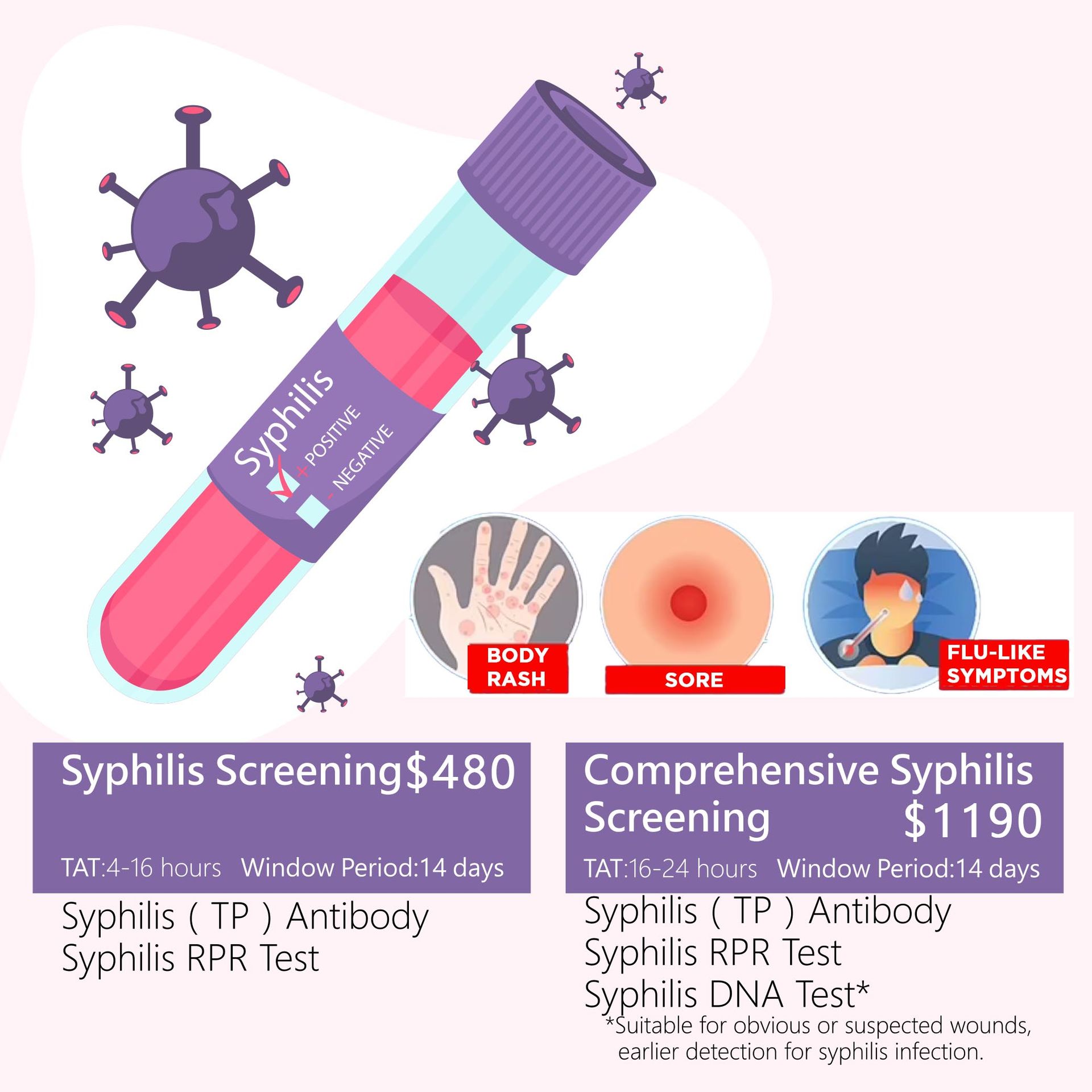 | Syphilis Antibody | $290 | 14 days | Blood | 8-24 hours |